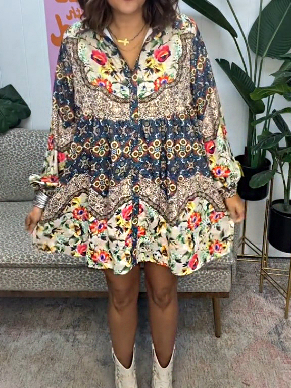 Composition: Elastane, Polyester Fabric: Non-Stretch Hem Shaped: Flared Sleeve Type: Flounce Sleeve Length: Knee Length Color: Multicolor Waist Line: Natural Sheer: No Fit Type: Regular Fit Details: Ruffle Sleeve Length: Short Sleeve Pattern Type: Tropical Neckline: V neck Style: Boho Type: Smock Location: All Fabric Type: Woven Care Instructions: Machine wash or professional dry clean Material: Woven Fabric