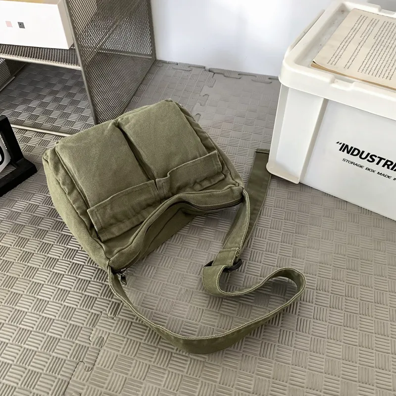 Unisex Large Canvas Solid Color Streetwear Square Zipper Shoulder Bag