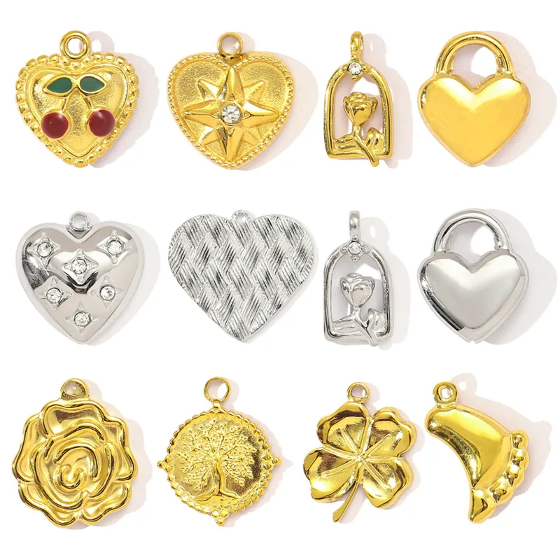 Wholesale Vintage Style Four Leaf Clover Cherry Heart Shape 304 Stainless Steel Plating DIY Ornament Accessories