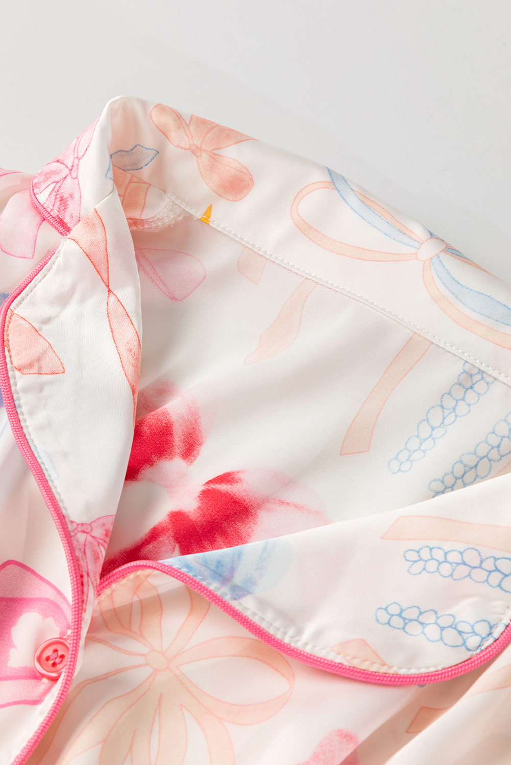 White Bow Knot Print Lapel Collar Wide Leg Satin Pajama Set