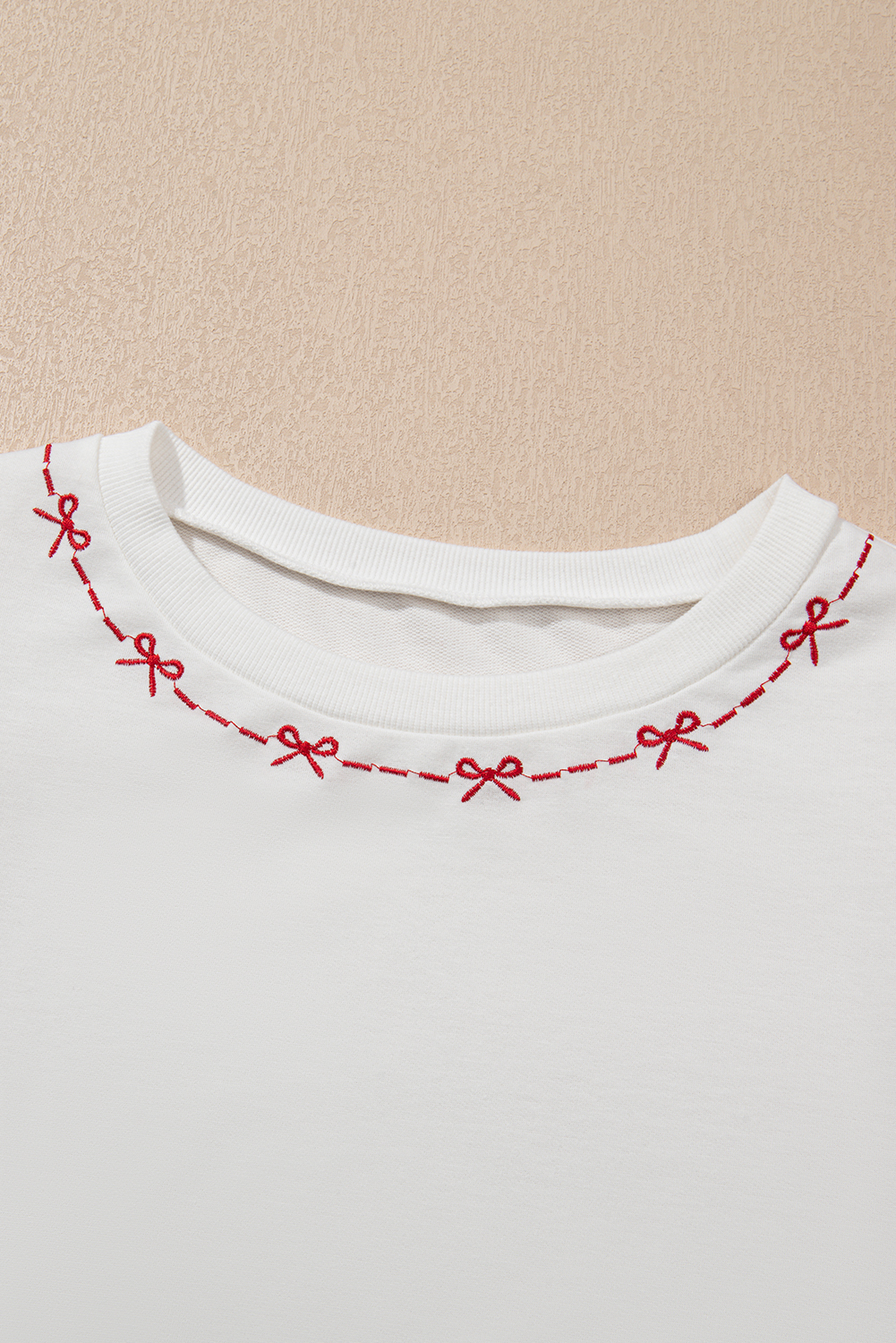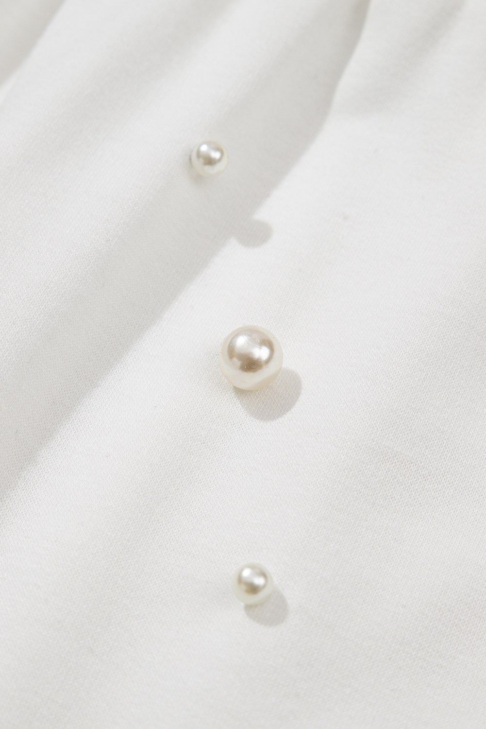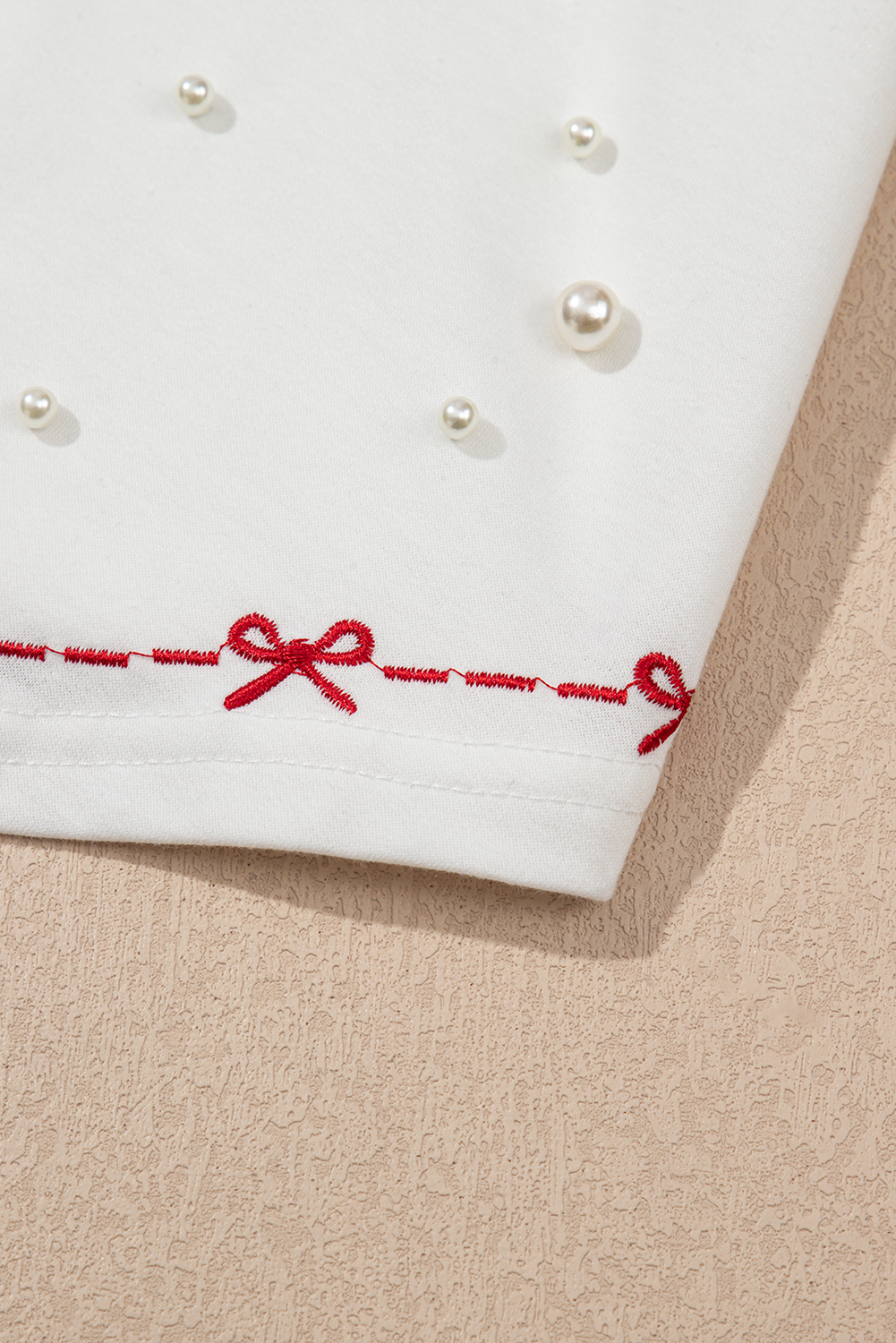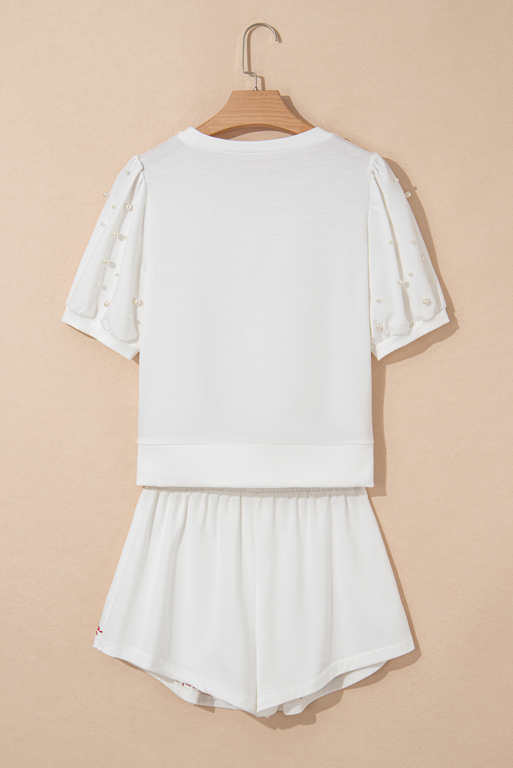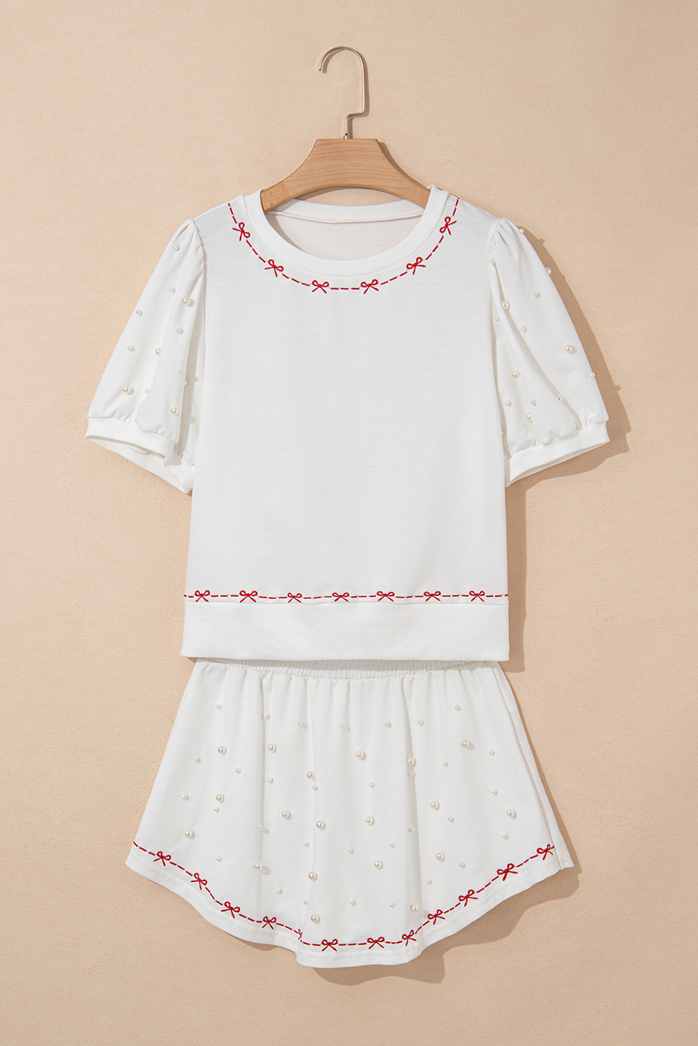 White Contrast Bow Trim Pearl Puff Sleeve Blouse and Skort 2pcs Set