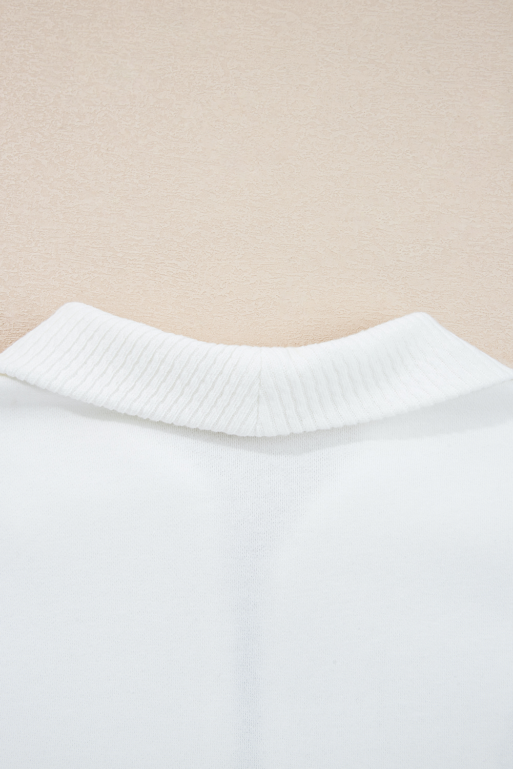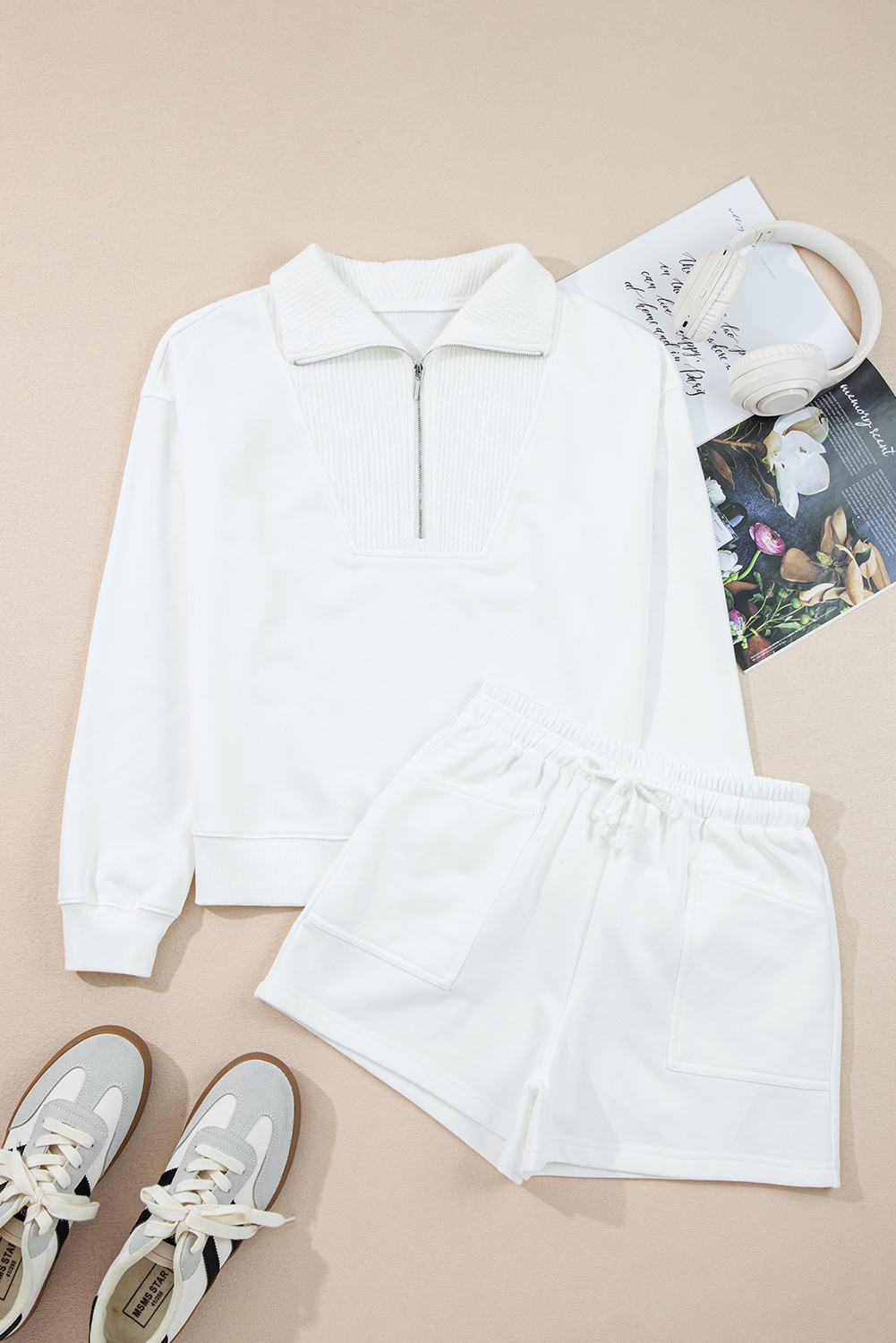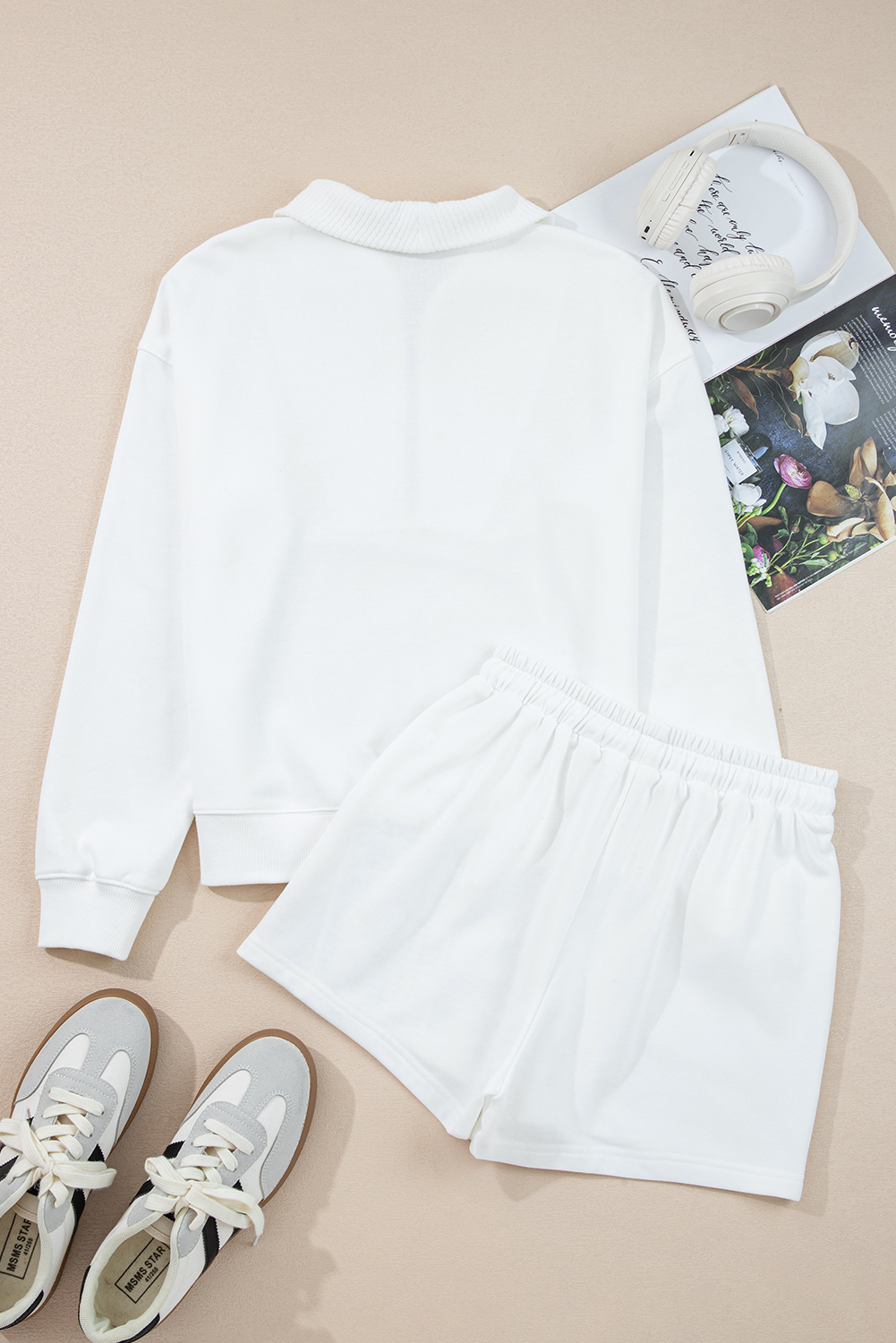 White Ribbed Collar Drop Shoulder Sweatshirt and Shorts Set