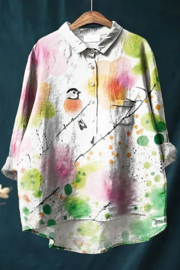 Wholesale Bird Print Casual Linen Button-Up Shirt