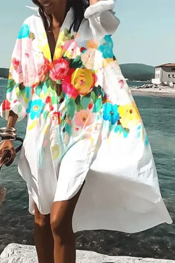 Wholesale Bohemian Floral Print Casual Shirt Dress
