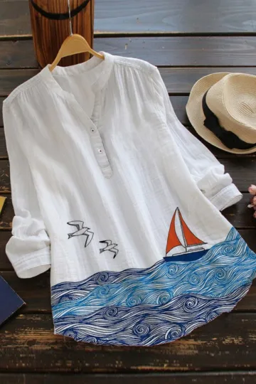 Wholesale Bohemian Sailboat Print Cotton Blouse Top