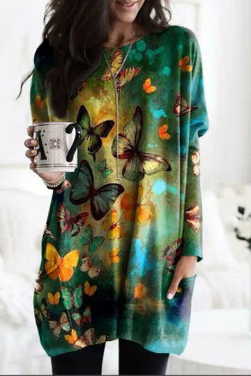 Wholesale Butterfly Retro Print Pocket Long Sleeve Sweatshirt Tops