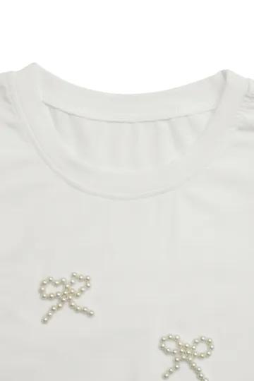 Wholesale Casual Bowknot Round Neck Pullover Beaded Puff Sleeve T-shirt