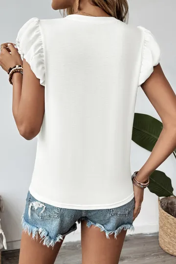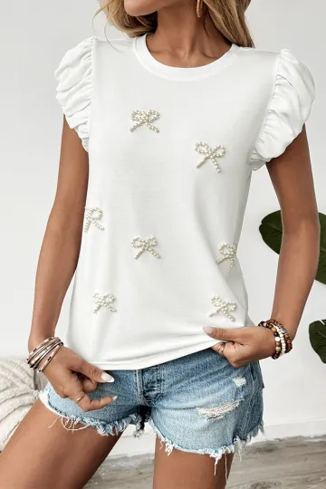 Casual Bowknot Round Neck Pullover Beaded Puff Sleeve T-shirt
