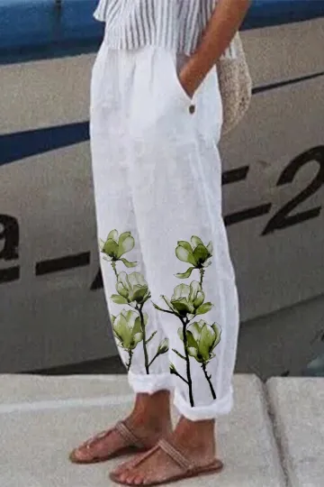 Wholesale Casual Floral Print Cotton Linen Trousers