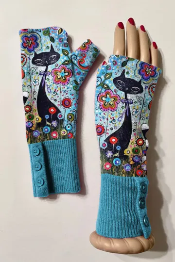Wholesale Cat Floral Print Fingerless Knit Gloves