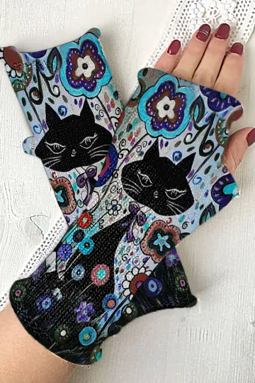 Wholesale Cat Print Bohemian Knit Fingerless Gloves