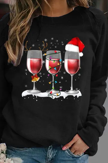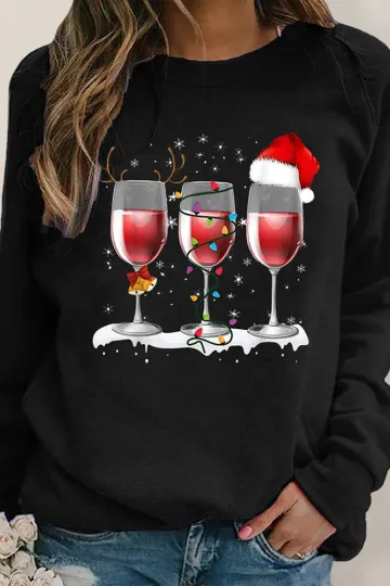 Christmas red wine cup printed long sleeved round neck hoodless sweater women