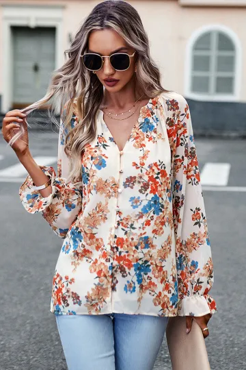 Wholesale Elegant floral print shirt with V-neck buttons blouse