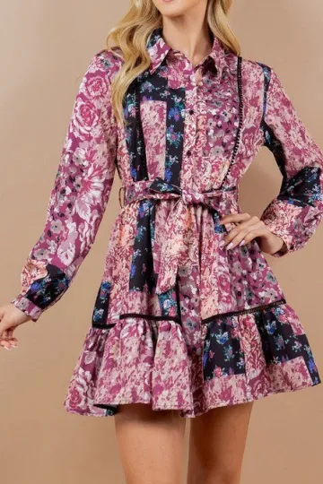 Wholesale Floral Print Patchwork Long Sleeve Shirt Dress