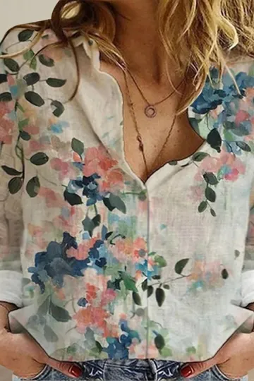 Wholesale Floral Print Casual V-Neck Linen Blouse