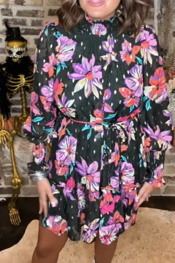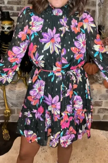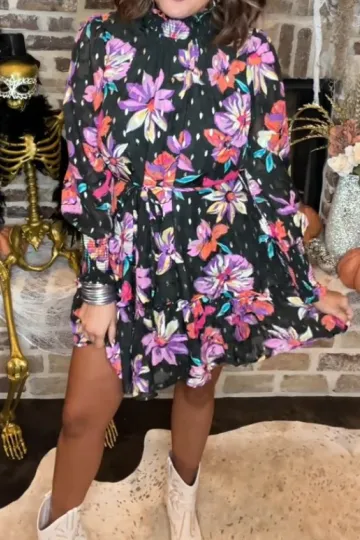 Wholesale Floral Print Ruffle Long Sleeve Mini Dress