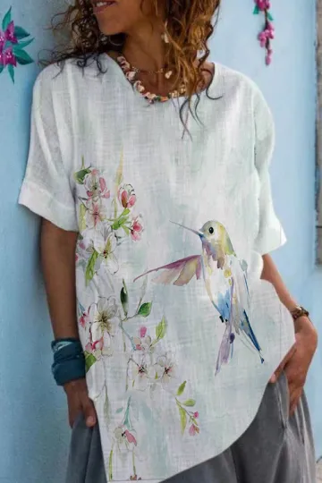 Floral Bird Print V-Neck Cotton Blouse