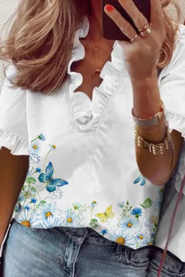 Floral Ruffle V-Neck Butterfly Print Blouse