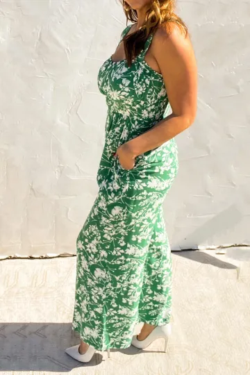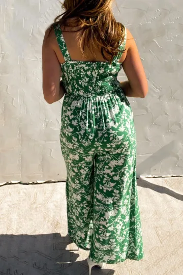 Green floral print wide leg jumpsuit