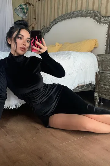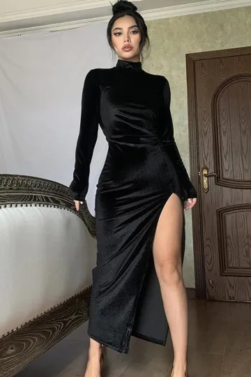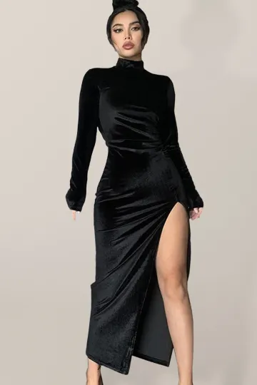 Wholesale High-neck long velvet dress slim sexy pleated slit dress