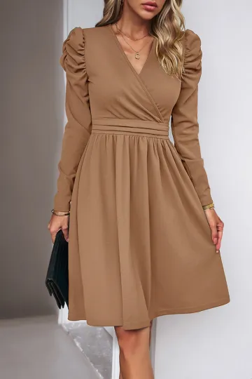 Ladies Fashion Elegant Solid Color V-neck Long Sleeve Dress