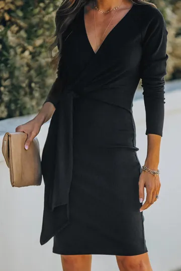 Wholesale Ladies Fashion V-Neck Ribbed Belt Dress