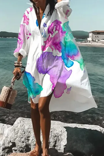 Ladies Watercolor Print Casual Shirt Dress