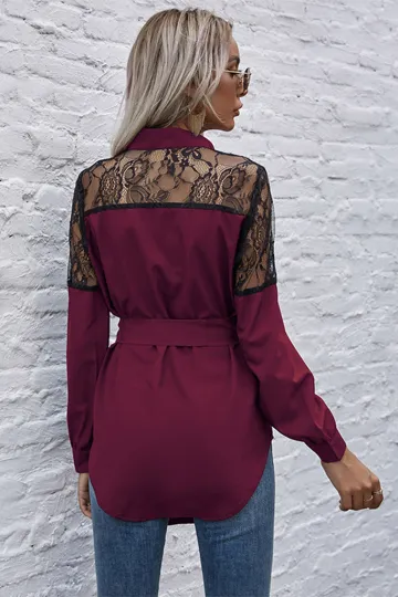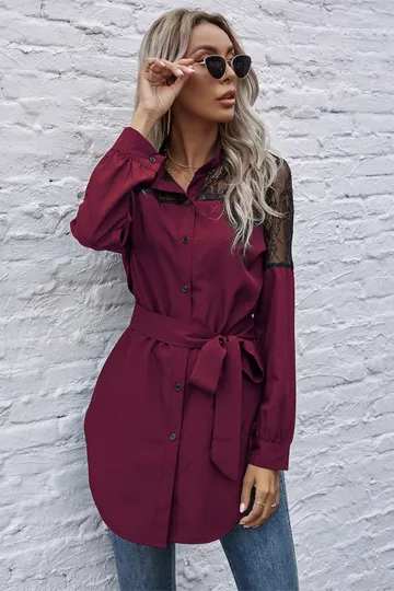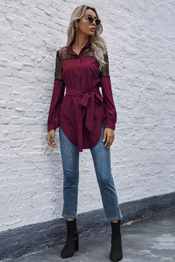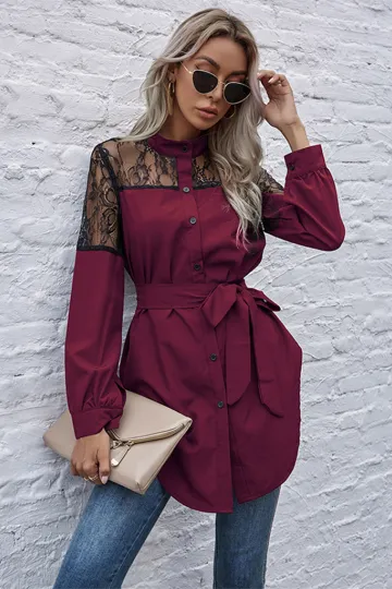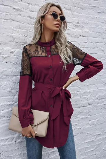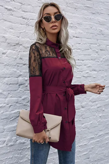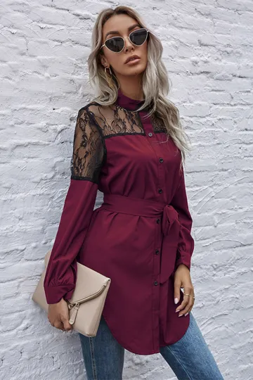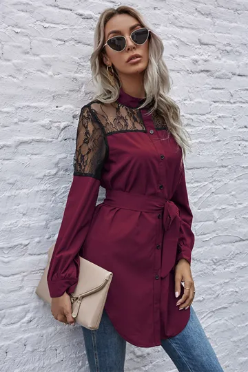 Wholesale Long round neck, long sleeves and waisted black patchwork lace shirt