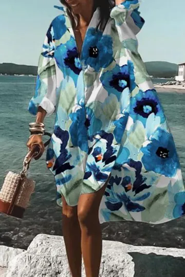 Wholesale Loose Floral Print Long Sleeve Shirt Dress