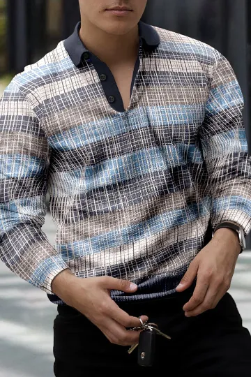 Men's Fashion Plaid Long Sleeve Polo Shirt