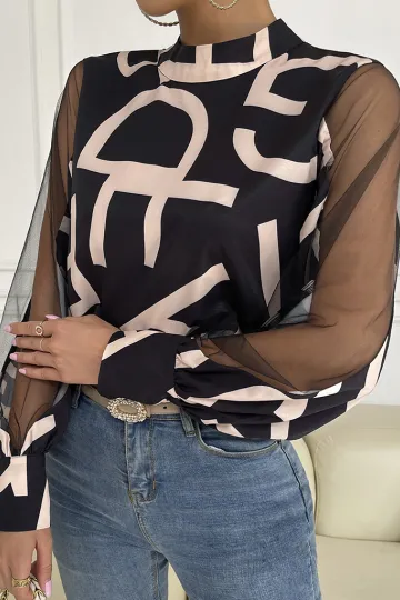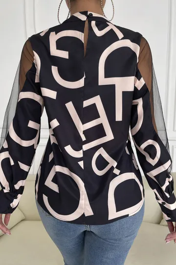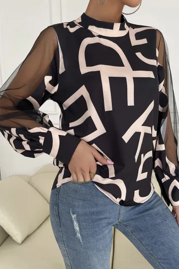 Wholesale Women's geometric print stitching mesh round neck long-sleeved top