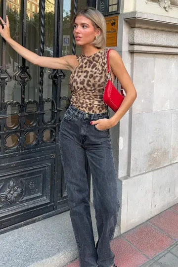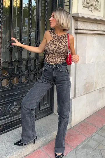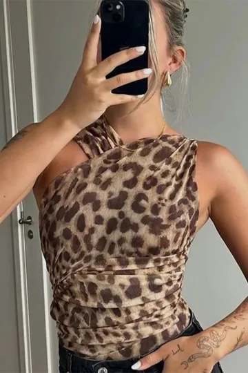 Wholesale New Asymmetric Pleated Leopard-Print Tulle Bodysuit