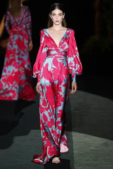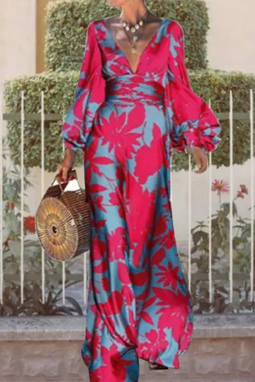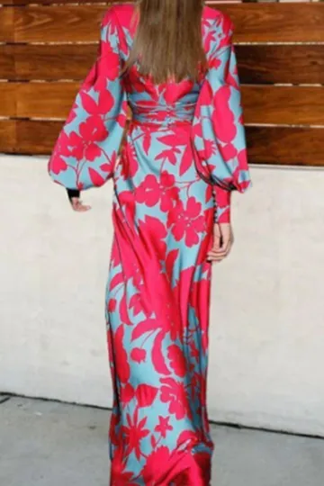 Wholesale New style high-waist commuting long skirt printed lantern sleeve v-neck dress