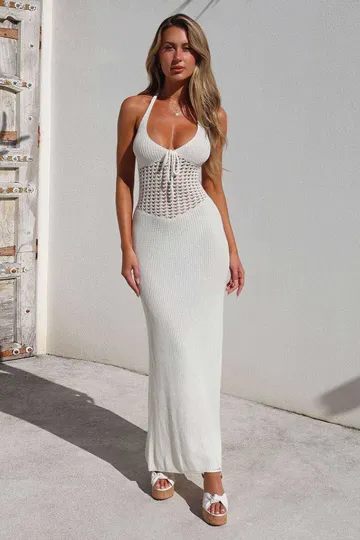 New women's fashionable halterneck sexy low-cut backless knitted hollow see-through dress