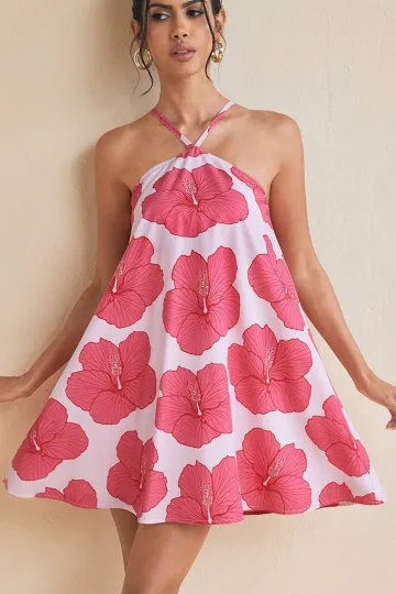 Women's sexy halter neck long swing printed short dress