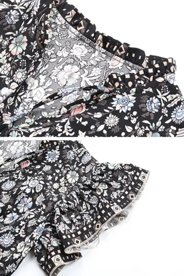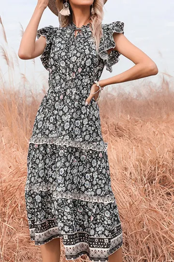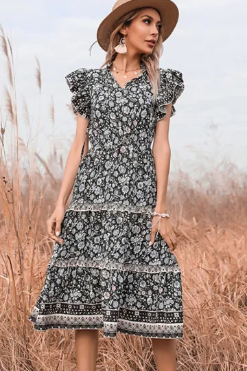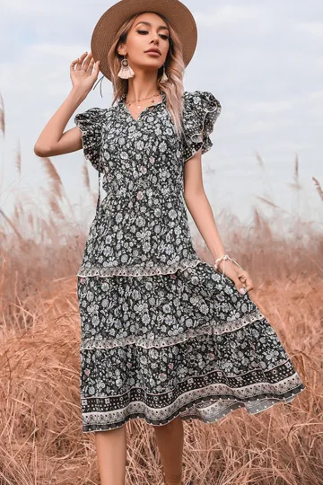 Wholesale Retro women's v-neck fungus fringed floral dress