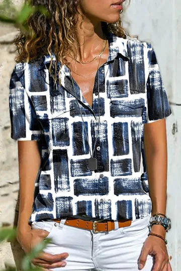 Ladies lapel single-breasted loose casual short-sleeved pocket shirt
