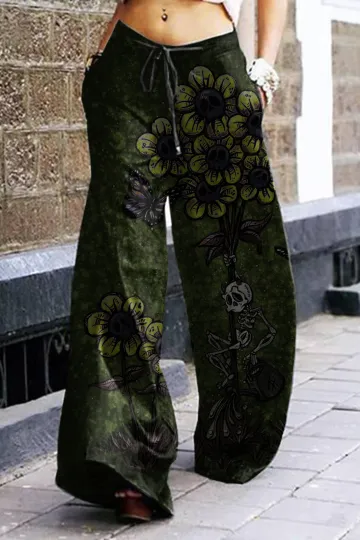 Wholesale Skull Flower Print Loose Wide-Leg Pants