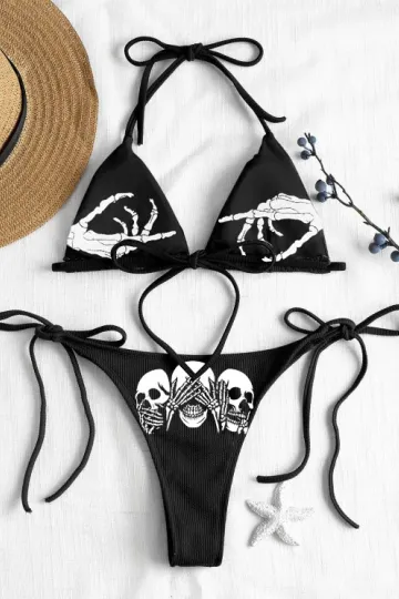 Wholesale Skull Hand Print Tie-Up Bikini Set