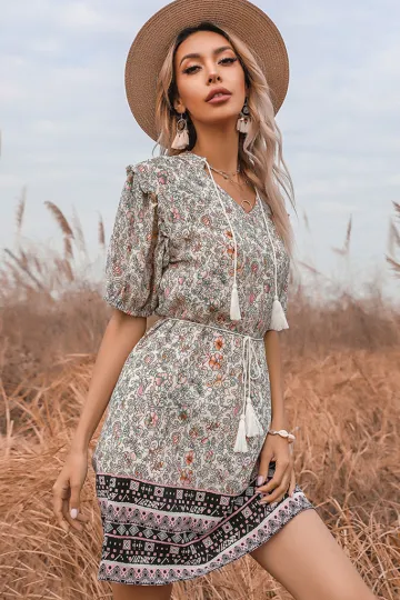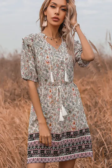 Wholesale Slim Fit Fringed V-Neck Tie Floral Dress