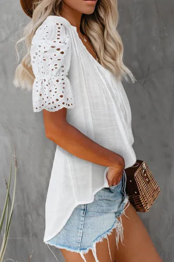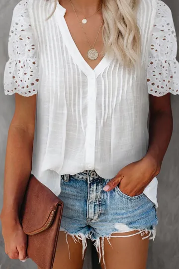 Wholesale Solid color V-neck front pleats lace puff sleeves splicing single-breasted multi-button shirt