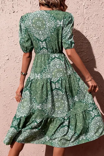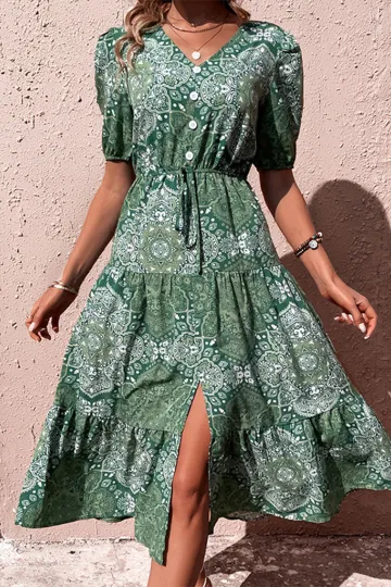 Wholesale Spring and summer elegant dress floral V-neck puff sleeve side slit long dress