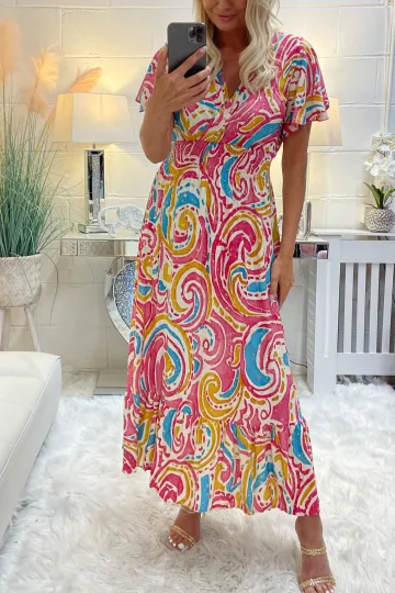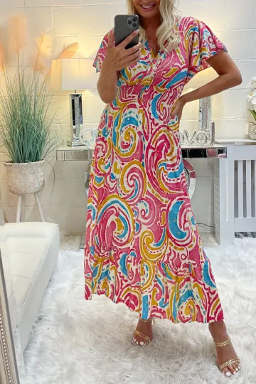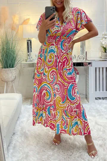 Wholesale Swirl Gold Foil Shirred Maxi Dress