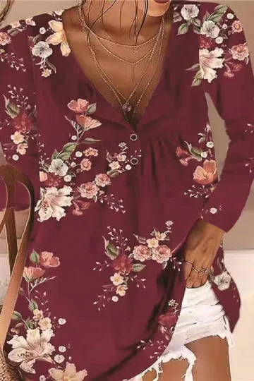 Wholesale V Neck Floral Print Long Sleeve Casual Tops Blouse