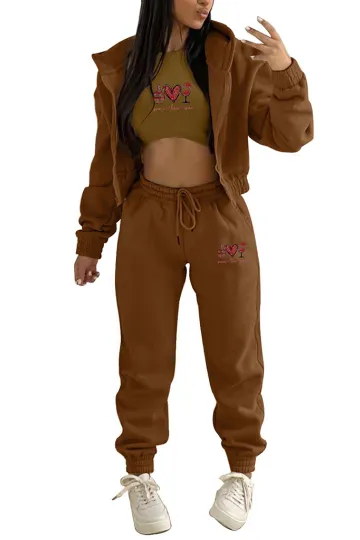 Valentine's Day Christmas love wine glass printed hooded sports and leisure suit (three-piece set)