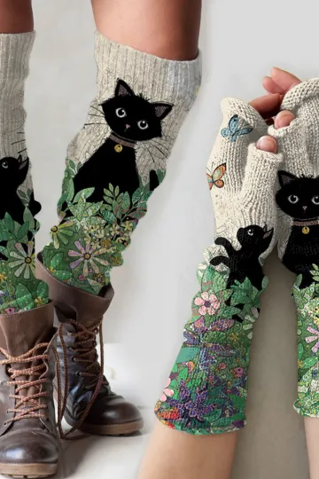 Vintage Cat Floral Knit Leg Warmers Fingerless Gloves Set