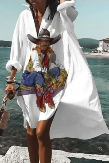 Wholesale Vintage Cowboy Print Casual Shirt Dress