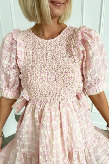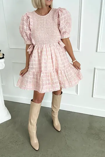 Wholesale Vintage pleated plaid puff sleeve mini dress