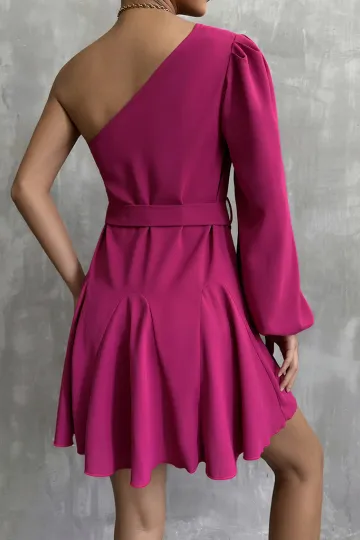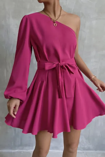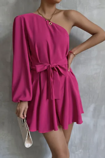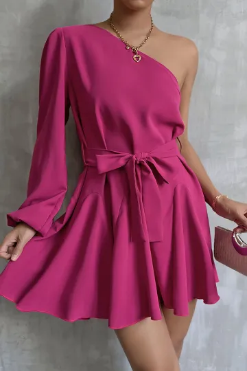 Woman'S Autumn New Solid Color Slanted Shoulder Unilateral Sleeve A-Line Swing Fashion Casual Dress