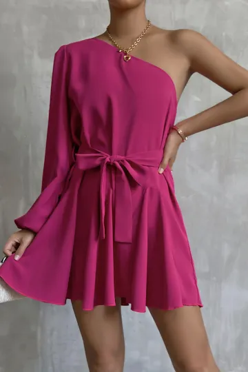 Wholesale Woman'S Autumn New Solid Color Slanted Shoulder Unilateral Sleeve A-Line Swing Fashion Casual Dress